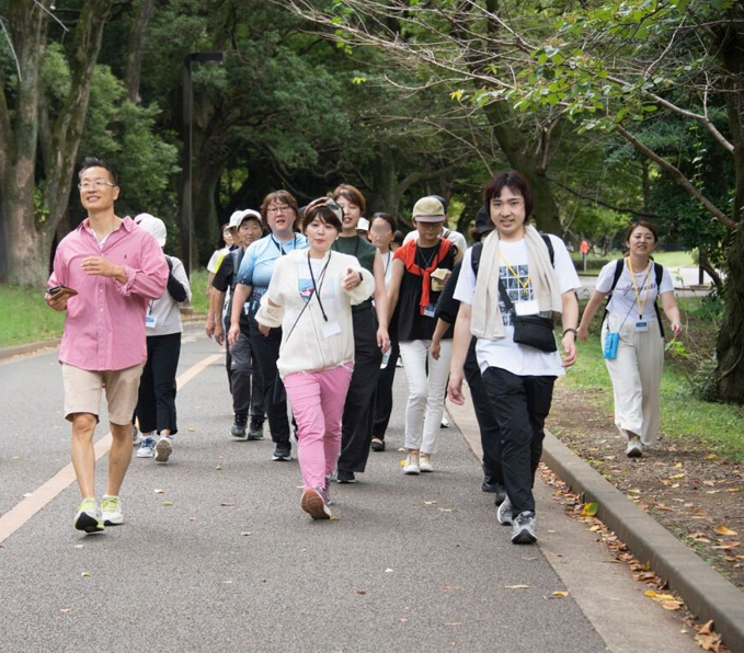 順天堂大学大学院 教授・谷本道哉先生指導のもと、ご自愛市の会場を出発し、代々木公園内をウォーキング。5分ごとに早歩きをしたり、ランジをしながら歩いたり、階段を1段飛ばしで上ったり。たっぷり汗をかくほどの運動量!